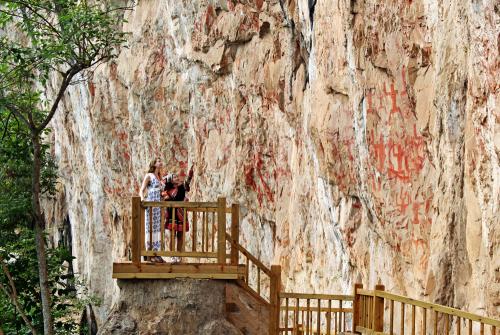 “初識壁畫認前朝,色自丹丹跡未凋。”千年的時光,也打磨不去花山巖畫的色彩,這不能不說是一個奇跡。關于繪畫的顏料,目前已有定論。據介紹,歷年來國家文物保護部門的有關專家,先后用科技手段對花山巖畫的作畫顏料進行過檢測,發現其中的主要成分是一種天然礦物質原料——赤鐵礦。版權所有山東聊城聊之旅國際旅行社有限公司,轉載必究!然而只有這天然赤礦粉,無法在堅硬、光滑而且直立的崖壁上作畫,必須配以粘劑調合。經過進一步檢驗,發現顏料里的確包含有膠著劑成分,但是檢測出來的膠類,到底是植物膠還是動物膠?以當時較為原始提煉工藝,古駱越人又是如何獲取這些成分的?膠與赤鐵礦又是如何配制的?這又給人們留下了許多謎團。