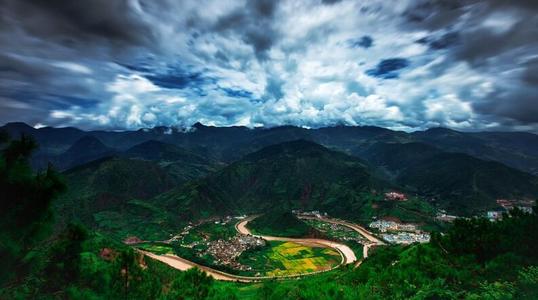 怒江,流經(jīng)云南貢山縣丙中洛鎮(zhèn)日丹村附近,由于王箐大懸?guī)r絕壁的阻隔,江水的流向從由北向南改為由東向西,流出300余米后,又被丹拉大山擋住去路,只好再次調(diào)頭由西向東急轉(zhuǎn),在這里形成了一個(gè)半圓形大灣,稱為怒江第一灣。灣中心有一個(gè)村子叫坎桶村,這里江面海拔1710余米,氣勢磅礴,灣上怒江臺地平坦開闊,高出怒江500米,構(gòu)成三面環(huán)水的半島狀小平原,小平原四周景物宜人。