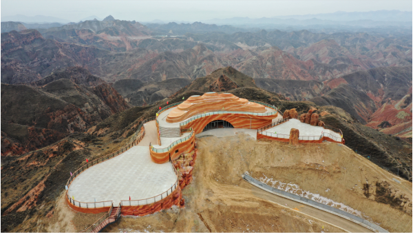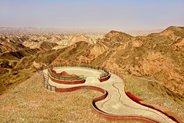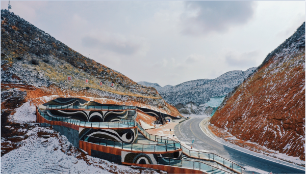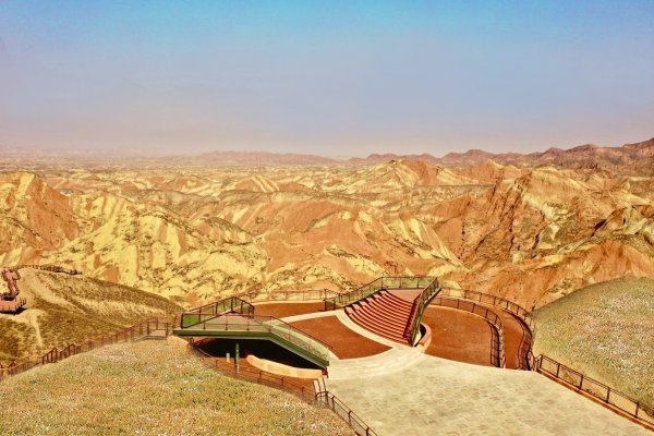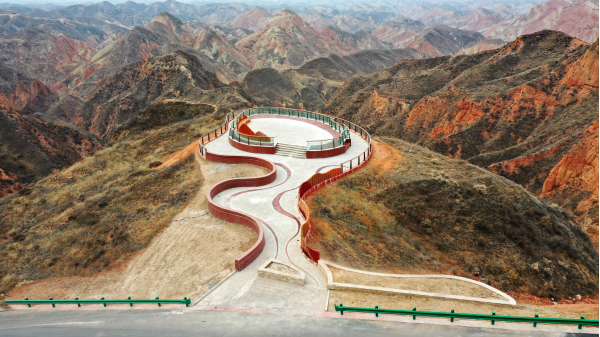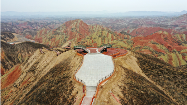 九色丹青觀景平臺九色丹青觀景平臺海拔1748米,平臺的造型宛若一把琵琶橫鋪在丹霞崖壁之間,遠遠望去,渾然天成。這里彩色的千巖萬壑仿佛觸手可及 ,色彩斑斕的丘陵仿似上帝的調色板,富含石青、石綠、朱砂、白堊、黃赭石等三十余種礦物質的巖石在陽光的照射下,各種色彩濃烈地交織在一起,色調或如波浪順著山勢起伏,或從山頂傾瀉而下,山形肌理狀若潑墨山水,美不勝收。