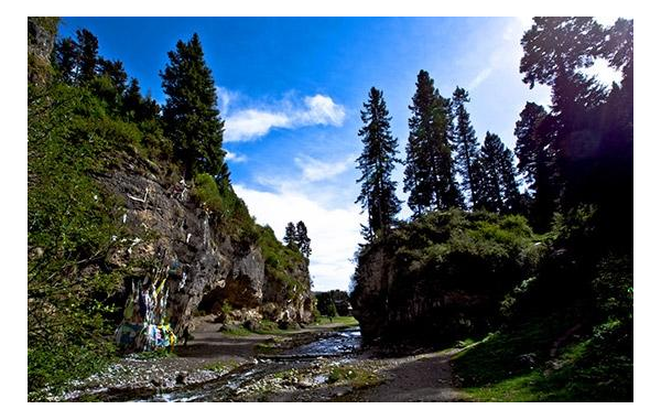 納摩大峽谷在谷口領略了神秘的宗教文化之后,你可以進溝去欣賞獨特的自然風光了。進谷口的右面懸崖下有一個洞穴,洞口扁平低矮,洞口前經常有信徒燒起柏香,青白色的煙霧緊貼著崖壁向上升騰,氤氳布滿了洞口,這就是傳說中的仙女洞。往洞內走過十來步便開朗了,石洞最高處有五六米,面積約有四百多平方米,這是一個溶洞,洞內西南角上一柱鐘乳石仿佛一位青春美貌的少女,她就是傳說中的仙女。仔細瞧瞧仙女,只見她的頭部已融入洞頂,留下胸部、雙肩、肚臍清晰可辯,栩栩如生。她那像肚臍的古眼中還冒著滴滴甘露。當地人給她取了一個美麗的名字:“華爾旦納摩”,譯過來就是仙女的意思。離仙女不遠處巖壁在離地一米處內深陷,形成一個“L”形的通道,約有兩米長,叫“中陰洞”。洞口一石象一塊如意,又如一柄靈芝支撐著巖頂。據說,人從通道一頭鉆入再從另一頭鉆出來就可以完成前世到今世的轉變,可以祛病延年,去禍增福。但罪4孽深重之人永遠過不去的。在仙女石與“中陰洞”之間,從巖壁上凸出一塊膝蓋式的奇石,光潔濕潤。據說能消除胃病患者的病患。環視洞壁,怪石嶙峋,似鷹、似象、似樹、似猴、似4兔......千姿百態、神形兼備。