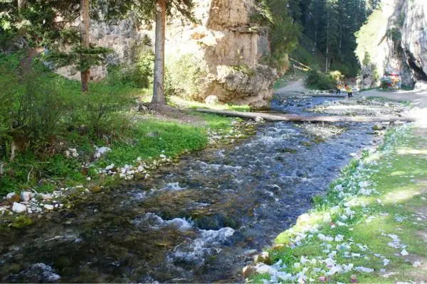 沿湖岸款步前行,越來越窄,轉過峽谷就看到小溪的源頭了,源頭從崖兩邊幾眼泉眼中潺潺涌出,清清淺淺地淌在碎石灘下,你不妨喝上兩口,這可是自然界中的純凈水,源頭之水,喝了會讓你感到一股沁人心脾的感覺。當地百姓管這泉水叫“乃溪”(圣水),是白龍江的源頭。此泉冬暖夏涼,天旱不枯,暴雨不澇,四季清澈見底。站在石灘上向左上方看去,在險峻的山坡上有一個洞穴俯視著泉眼,居高臨下,虎踞雄威,這就老虎洞。傳說這峽谷曾住著一條善良的白龍在此修道。有一年,山谷中突然發生了一場大火,大火蔓延,燃毀了樹林和莊稼,百姓無家可歸。正在修練的白龍見狀,想去拯救百姓,可神靈卻把它困在了巖石下,急得白龍渾身發抖黯然淚下,兩眼涌出一串串淚珠,淚珠沖破巖石,撲來了大火。從此這兩眼泉水再沒有間斷過,得救的百姓為感謝白龍的4恩德,便把從這泉眼中流出的河取名“白龍江”。從那以后,白龍江兩岸林木茂盛,人畜興旺。然而好景不長,一頭白額大虎常常從森林中出來傷害生靈。人們死的死,逃的逃,非常凄慘。一天,惡虎正在窮追來不及逃散的人們時,空中飄來一位慈祥的“仙女華爾旦納摩”,她用智慧降伏了惡虎,并把老虎關在石洞內,讓它日夜守護在白龍江源頭。人們過上了安居樂業的生活,而仙女“華爾旦納摩”因私自下凡而回不了天庭,就住進了仙女洞。從此這地方便有了“達倉納摩”這個美麗的名字。(藏語中虎穴叫“達倉”,仙女叫“納摩”)。連后來的格爾底寺也有“達倉納摩寺”之稱。