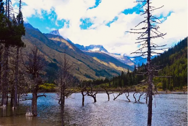 盆景灘的形成是由于山洪沖積的泥沙淤積阻塞,導(dǎo)致河流改道,淹死了原本在陸地生長(zhǎng)的沙棘樹。溪水中含有豐富的鈣化物,沙棘樹在被淹死之前,拼命吸收,根部附積了大量鈣化物,從而使得這些沙棘樹死而不倒。