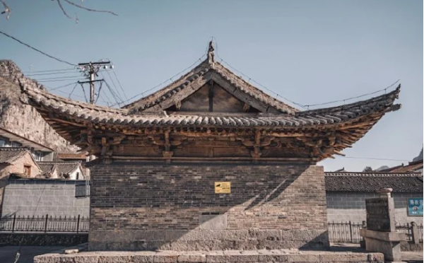 殿坐北朝南,面寬三間,進(jìn)深六椽,單檐歇山頂,布筒板瓦屋面。明間前后辟板門,柱頭斗栱四鋪?zhàn)鲉纬瓎蜗掳海撼逝袷健A杭転閺厣下睹髟欤罅簝啥酥苯哟钤谥^斗栱上,平槫垂直施卷云駝峰,上置隔架栱,至平梁瓜柱。
