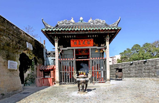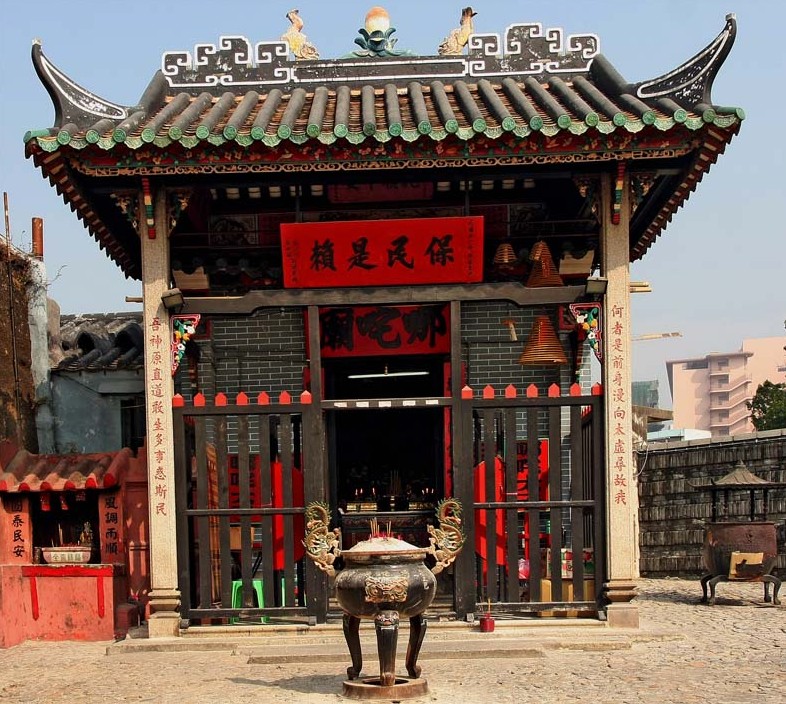 哪吒廟不大,坐落在澳門大三巴牌坊后的小山坡上,屹立在翠綠的炮臺山下,依附在舊城墻邊。哪吒廟,顧名思義是供奉哪吒的廟宇。在哪吒廟的正殿里,供奉著形態各異的哪吒神像,最中間的一尊,神態活潑,透著靈勁像極了小時候熟知的“哪吒鬧海”里的形象。建筑深8.4米,寬4.51米,為兩進式建筑,但中間沒有天井,是傳統中式廟宇中較罕見的例子。建筑主要由相連的門廳及正殿組成,正殿進深5 米,四面墻體均以青磚筑建而成,青磚表面抹灰并重新劃上磚線,屋頂為傳統硬山式,整體主要以灰色為主,除山墻上有少許草尾點綴外,一般不作裝飾。