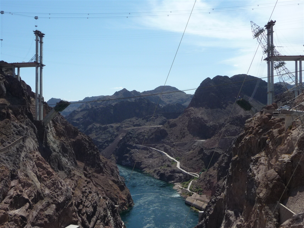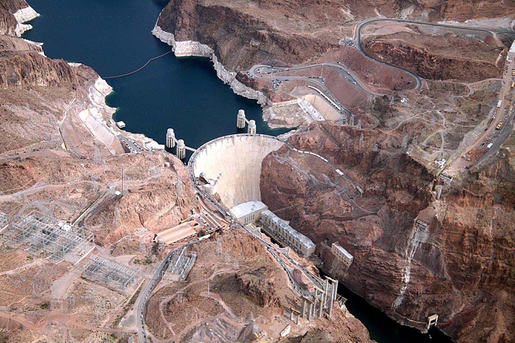 胡佛水壩(Hoover Dam)是美國綜合開發科羅拉多河(Colorado)水資源的一項關鍵性工程,位于內華達州和亞利桑那州交界之處的黑峽(Black Canyon),具有防洪、灌溉、發電、航運、供水等綜合效益。 大壩系混凝土重力拱壩,壩高221.4m,大壩形成的水庫叫米德(Mead)湖,總庫容348.5億立方米,水電站裝機容量原為134萬kW,現已擴容到208萬kW,計劃達到245.2萬kW。于1931年4月開始動工興建,1936年3月建成,1936年10月第一臺機組正式發電。