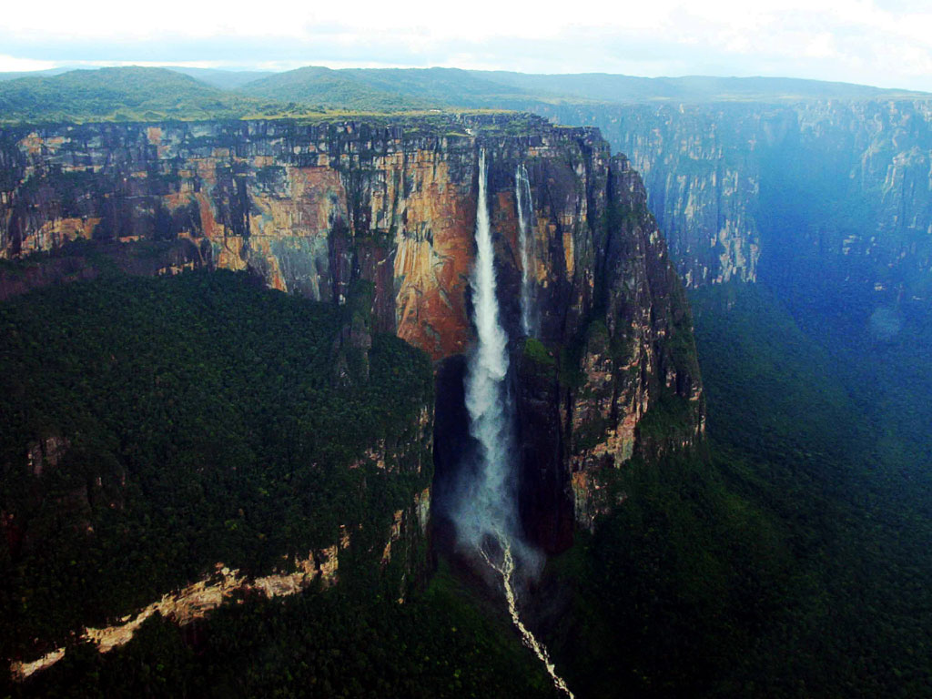 安赫爾瀑布(Angel Falls,通常依字義譯為天使瀑布,但不合語源),又名丘倫梅魯瀑布,世界十二大瀑布之一。當地的印第安人取名為“出龍”。位于南美洲委內瑞拉玻利瓦爾州的圭亞那高原,卡羅尼河支流丘倫河上。藏身于的委內瑞拉與圭亞那的高原密林深處。安赫爾瀑布是世界上落差最大的瀑布,丘倫河水從平頂高原奧揚特普伊山(Auyan-tepui)的陡壁直瀉而下,幾乎未觸及陡崖,落差達979.6米,大約是尼亞加拉瀑布高度的18倍。瀑布分為兩級,先瀉下807米,落在一個巖架上,然后再跌落172米,落在山腳下一個寬152米的大水池內。這個地區的熱帶雨林非常茂密,不可能步行抵達瀑布的底部。雨季時,河流因多雨而變深,人們可以乘船進入。在一年的其他時間里,只能從空中觀賞瀑布。