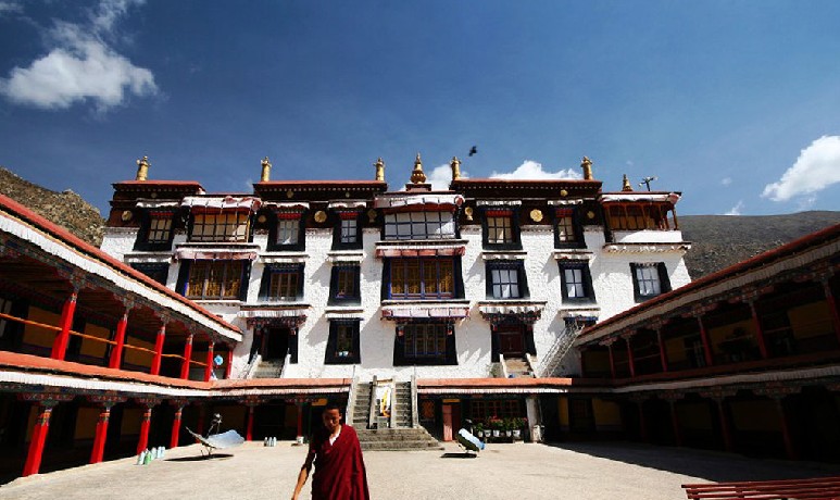 樓高3層,平頂宮堡式建筑,恢宏壯麗。殿內(nèi)供有藏傳佛教格魯派創(chuàng)始人宗喀巴大師等人佛像,陳設(shè)豪華,供器甚多。明崇禎十五年(1642年),和碩特蒙古首領(lǐng)固始汗支持達(dá)賴五世打敗藏巴汗后,建立了格魯派統(tǒng)治政權(quán),其政權(quán)機(jī)構(gòu)即設(shè)于此。直到清順治五年(1648年)布達(dá)拉宮白宮建成,達(dá)賴五世由該處移居布達(dá)拉宮,政權(quán)機(jī)構(gòu)也隨著轉(zhuǎn)移。后來,把格魯派統(tǒng)治的西藏地方政權(quán)統(tǒng)稱為甘丹頗章政權(quán)。