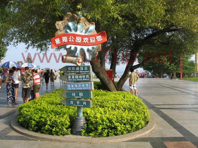 園內建有望海亭、迎潮亭、望海樓等景觀,若有興致,不妨登上多姿多彩的望海亭,即可鳥瞰大海的壯闊,令人心醉神迷。另外還建有海上樂園,高臺滑水,激流勇進探險,圣亞海洋世界等旅游觀光設施。這里的圣亞海洋世界是中國、新西蘭等國的5家公司共同投資興建的大型旅游項目。主要提供水下海景與海洋生物觀賞服務。它分上下二層:一層有五彩繽紛的熱帶魚展廳,供游人觀賞和觸摸的巖石池;