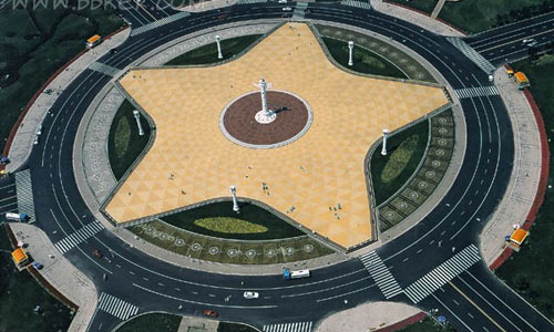 從廣場中央大道中心點往北500米是會展中心;往南是百年城雕廣場,500米外是藍色的大海。中央大道紅磚鋪地,兩側綠草如茵,每隔20米設一個航標燈造型的石柱燈,象征著中國正面向大海,走向世界。