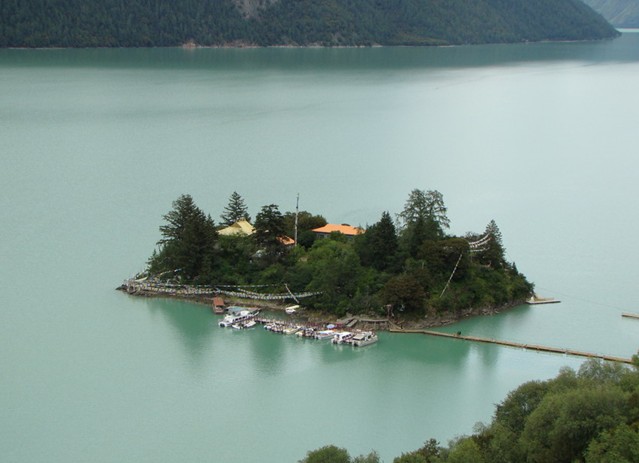 小島上有唐代的建筑“錯(cuò)宗工巴寺”,是西藏有名的紅教寧瑪派寺廟,建于唐代末年,距今已有1500多年的歷史了。錯(cuò)宗寺為土木結(jié)構(gòu),上下兩層,殿內(nèi)主供蓮花生、千手觀音和金童玉女。寺南有一株桃和松的連理樹,春天時(shí),桃花與青松相映,煞是好看。