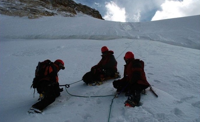 三號(hào)營(yíng)地到四號(hào)營(yíng)地之間是東南山脊的刃脊,冰雪和巖石混合路段,雪坡上積雪較深,又有大的裂縫,必須拉繩索,此外還需要大量的路標(biāo)。如果天氣不好,隊(duì)員在這里一旦迷路,極易掉入懸崖。