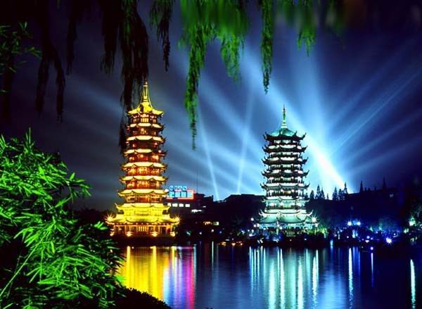 桂林日月雙塔號稱世界第一銅塔,是桂林旅游的一個絕美夜景觀賞地。地處桂林市中心區,座落在桂林城的中軸線上,與“象山水月”相鄰。象山是桂林的城徽,而雙塔則是新桂林的標識。其中日塔高41米共九層,通體均為純銅裝飾,耗用銅材350噸,金碧輝煌,并有電梯供游客觀光乘坐。銅塔所有構件如塔什、瓦面、翹角、斗拱、雀替、門窗、柱梁、天面、地面完全由銅壁畫裝飾,整座銅塔創下了三項世界之最——世界上最高的銅塔,世界上最高的銅質建筑物,世界上最高的水中塔。 月塔高35米共七層,為琉璃塔。每層的雕花彩繪門窗寓意不同的主題,富含中國傳統韻味,通過水下18米長的水族館與日塔連接,其地宮之中有桂林明代青花梅瓶大型壁畫。杉湖日月雙塔已成為觀賞桂林城市精華美景的勝地。