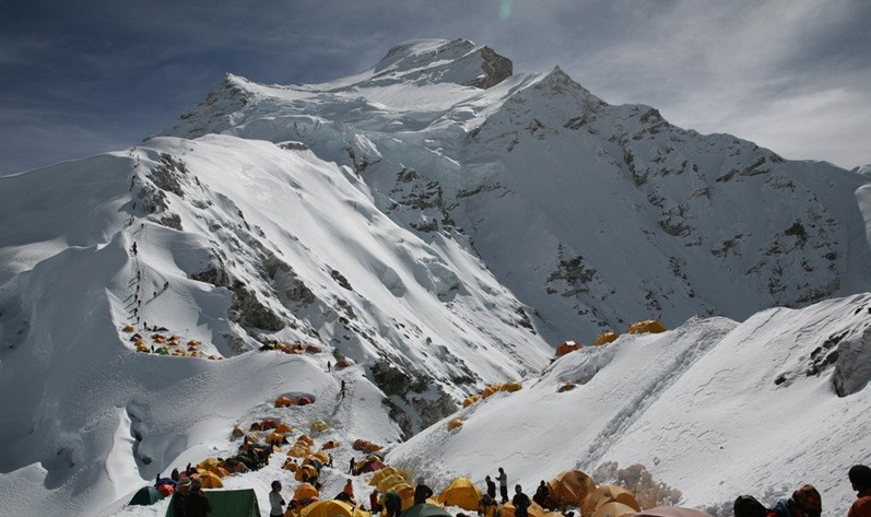 首先從拉薩沿南藏公路南行,經(jīng)日喀則和拉孜,行程718公里到達(dá)定日,再沿簡易公路南40多公里,就可到卓奧友峰北麓,直抵加布拉冰川末端的登山大本營。這里的海拔高度為4959米,地形開闊避風(fēng),且水源充足。