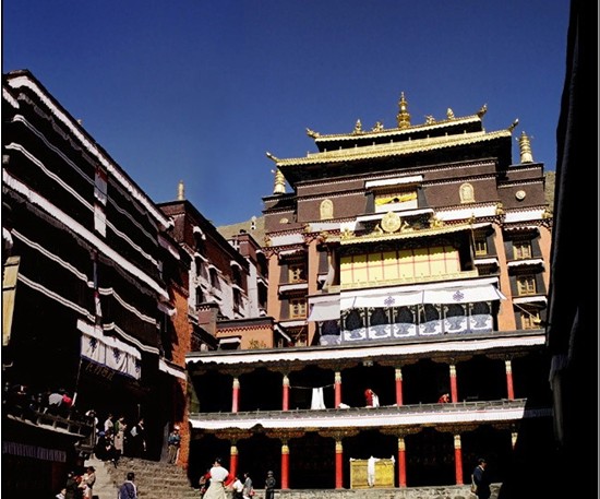 原信奉覺朗派,到五世達(dá)賴?yán)飯?zhí)政時(shí)期,該寺屬13座寺廟換教寺之一,故信奉格魯派。寺院曾有35個(gè)殿堂和一個(gè)誦經(jīng)大殿,3