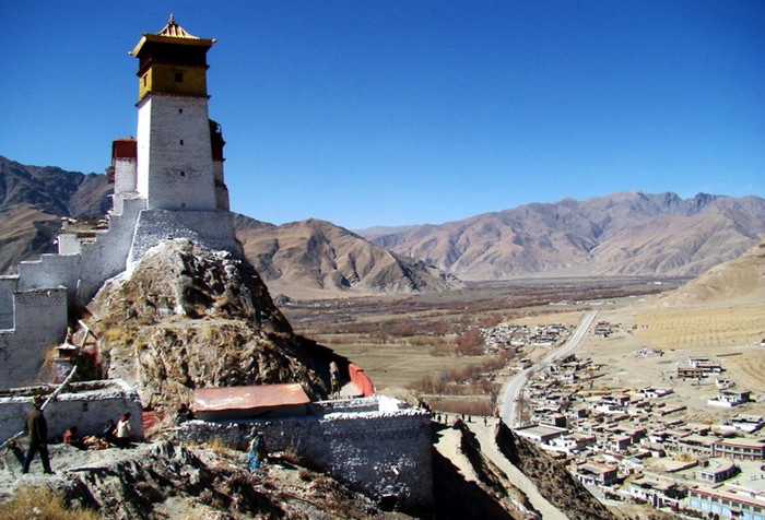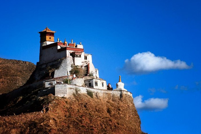 雍布拉康,藏語意為“母子宮”,是西藏歷史上第一座宮殿,也是西藏最早的建筑之一,位于山南地區澤當鎮東南,高聳于雅礱河東岸扎西次日山頂。相傳是苯教徒于公元前2世紀為第一代藏王聶赤贊普建造,后來成為松贊干布和文成公主在山南的夏宮,五世達賴時改為黃教寺院。 雍布拉康主要供奉釋迦牟尼佛像。宮殿內的壁畫上生動地描繪了西藏的第一位國王,第一座建筑,第一塊耕地的歷史故事。 雍布拉康分為兩部分,前部是一幢多層建筑,后部是一座方形高層碉堡望樓,與前部相連。公元5世紀,藏王托托念贊時期,傳說一本佛經從天而降,正好跌在雍布拉康宮頂,當時無人能識。有圣人斷言,到了公元7-8世紀就有人能解讀此書。所以這本書被很好地保留在雍布拉康。