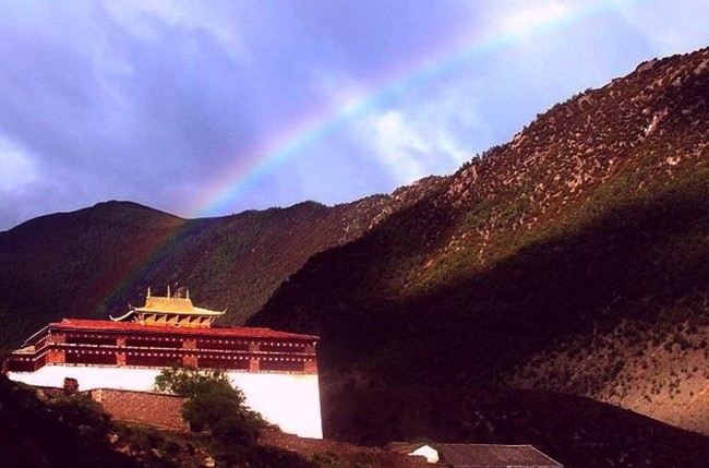 雍布拉康位于澤當11公里的扎西次日山上。“雍布”意為“母鹿”,因扎西次山形似母鹿而得名,“拉康”意為“神殿”。雍布拉康是西藏歷史上第一座宮殿。據史書記載始建于公元前二世紀。松贊干布暑期由宮殿改作寺廟。文成公主初來西藏時每到夏季都會和松贊干布來這里居住。至五世達賴時又在原碉樓式建筑基礎上修了四角攢尖式金頂,并將其改為黃教寺院。