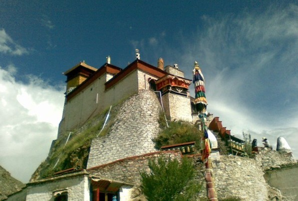雍布拉康據傳說建于公元前二世紀,那個暈頭暈腦就做了吐蕃第一代藏王的聶赤贊普,除了成為“脖子作寶座的英王”外,還得到了這座特意為他而建的三層“紅柳香莎宮”。這故事其實聽著挺耳熟,俗點兒說就跟聽到誰誰忽然間中大獎,一下子就奔有房有車的“高級階段”的故事似的,現在宮殿二層墻壁的壁畫上還繪有這段傳奇故事,讓我一類的后人為之景仰不已。由此,這座宮殿也成為歷代吐蕃贊普的王宮,直到第三十三代贊普松贊干布統一高原,將王都遷往拉薩。不過,即使英明神武如松贊干布,也不敢忘了雅礱這塊吐蕃的根本之地,不時還回來居住,據說文成公主遠嫁到西藏后的第一個夏天就是在雍布拉康度過的。雍布拉康還有一神奇之處,自第一代聶赤贊普以來,歷代贊普皆以苯教為護國教,直到第二十八代贊普拉妥妥日年贊時期。傳說有一日天降“神物”于雍布拉康的頂上,內有經書、法器和咒語若干,可是當時誰也不識這些東西的奇妙,只知是些好東西,于是將之供奉起來,還取了一名叫“寧波桑哇”,意思是秘室。直到后來許多年以后,才有后人識出密室中的《諸佛菩薩名稱經》等珍貴經卷,方悟出其實佛教在松贊干布時期以前早就進入了西藏了,只是因當時地上的苯教勢力太盛,才只好先“空投”,再“埋伏”,以待后日。該宮殿隨之成為佛教圣地,也由此變成了一佛殿,成為許多高僧大德修行之地,也成為許多“伏藏”的發現和埋藏之地。