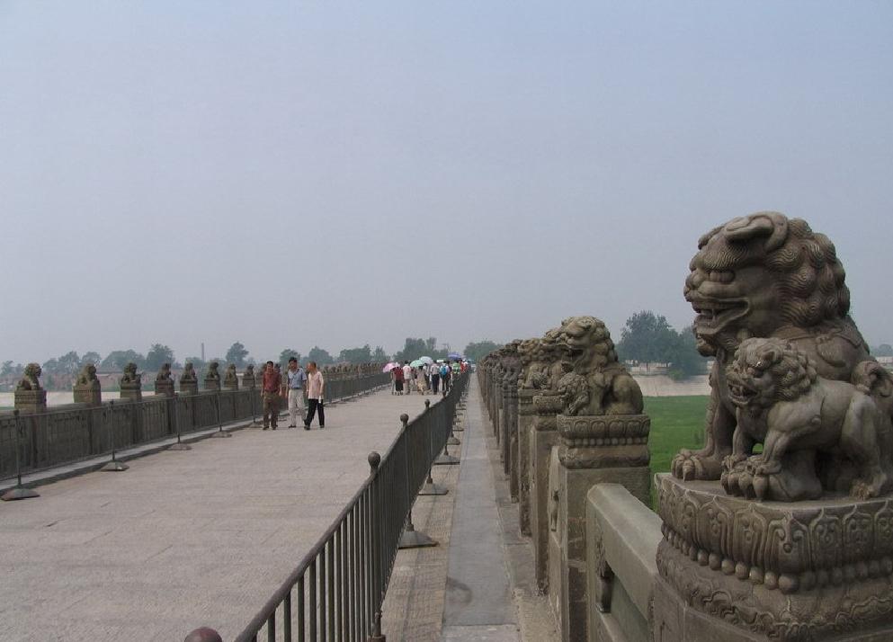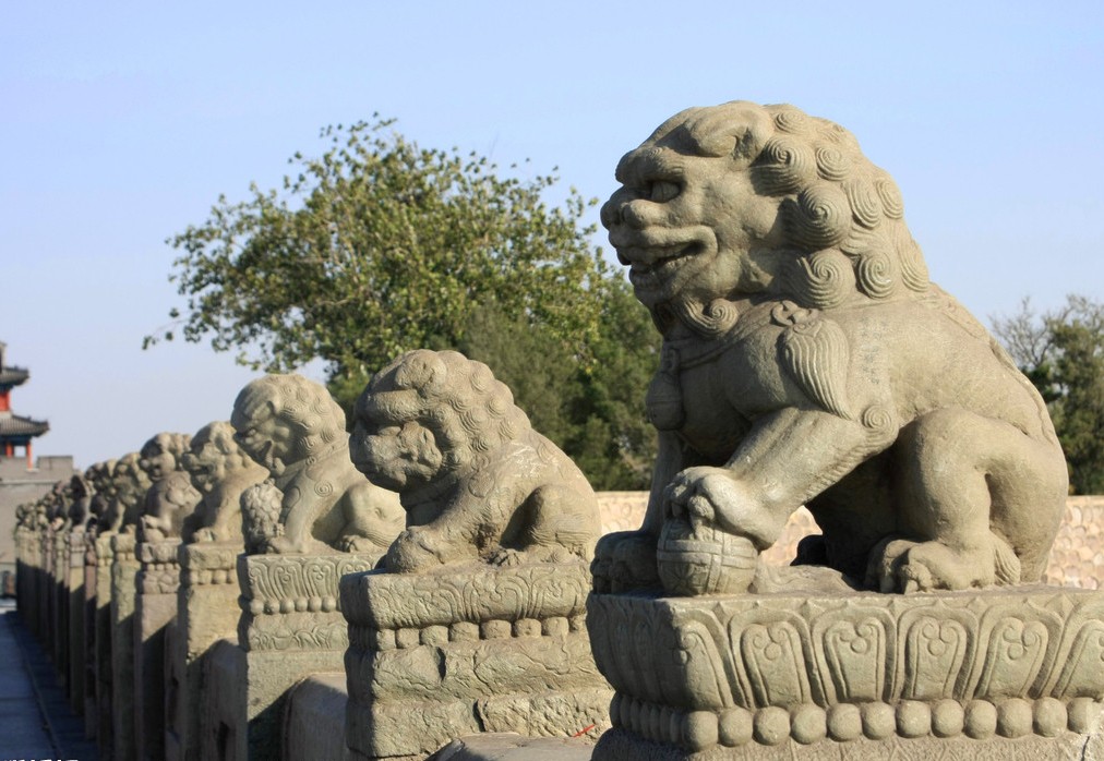 盧溝橋始建于1189年六月,明昌三年(1192年)三月完工。兩側石雕護欄各有140條望柱,柱頭上均雕有石獅,形態各異,據記載原有627個,現存501個。石獅多為明清之物,也有少量的金元遺存。“盧溝曉月”從金章宗年間就被列為"燕京八景"之一。