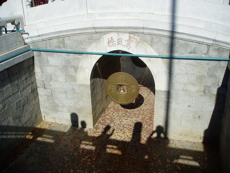 始建于清康熙四十五年(1706),后毀壞。1988年重建。為南北向的單孔石橋。橋下并無(wú)水。橋洞兩側(cè)各懸一枚古銅錢模型,刻有“鐘響兆福”四字,錢眼內(nèi)系一小銅鐘。那么,為什么要修建一座橋呢?據(jù)說(shuō),由于北方風(fēng)猛雨少,觀外原有座“甘雨橋”,人們便在觀內(nèi)修了這座“窩風(fēng)橋”,兩座橋象征風(fēng)調(diào)雨順之意。 另有一說(shuō)為紀(jì)念全真教創(chuàng)始人王重陽(yáng)而建,據(jù)說(shuō)王重陽(yáng)棄家出游,在陜西甘河橋遇異人授予他修煉真訣,于是出家修道,創(chuàng)建全真教。后世全真弟子修建“甘河(干河)橋”以為紀(jì)念。