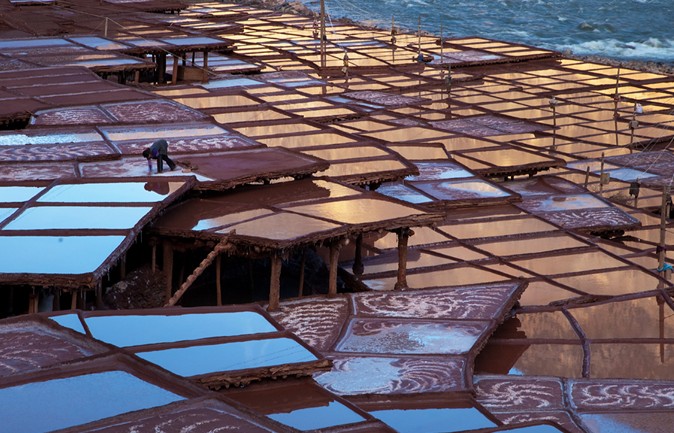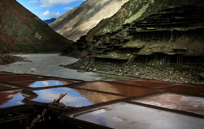 鹽井自古就有產鹽的歷史,而鹽田又成為這里獨有的一道人造景觀。所謂的鹽田,其實是在洶涌澎湃的瀾滄江邊搭建的一些土木結構的平臺。順著鹽田之間的小道下坡,鹽水井就挖在江邊。這兒的鹽水井有的深近10米,工人們身背圓柱形的木桶,將鹵水存儲在鹽田邊的槽溝里,其他的工人將鹵水從槽內舀出倒入鹽田里。經過一天日頭的暴曬和江風的吹拂,第二天,鹽田里就會結晶出白色的鹽粒了。 依山搭建層層的鹽田氣勢雄偉,鹽民們沿著祖先的足跡,走在崎嶇險峻的小道上辛勤地勞作,在延續生命的同時也創造著世界上獨特的景觀。
