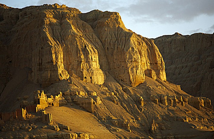 象雄與古格,兩個一度各領風流的西部古國,從此消逝在歷史的煙云之中,令考古學家、歷史學家、民族學家們在浩翰的史海中苦苦搜尋,力圖用科學的證據來復原其歷史的舊貌。關于古格王國,雖然各國的歷史學家與考古學家曾作過大量的調查研究工作,但也有許多問題時至今日仍然藏在云山霧海之中未能得解。其中,一個最令考古學家感興趣的問題在于:當年這個王國最強盛時,一度號稱達到十萬之眾,但古格王國都城遺址扎不讓所有能住人的洞窟加起來,也只能容納兩千人左右,這不能不讓學者們推測,在這片神秘的土地上,一定還有無數個像扎不讓這樣的古城堡隱藏在大漠荒原深處,被歷史的風塵所掩蓋。