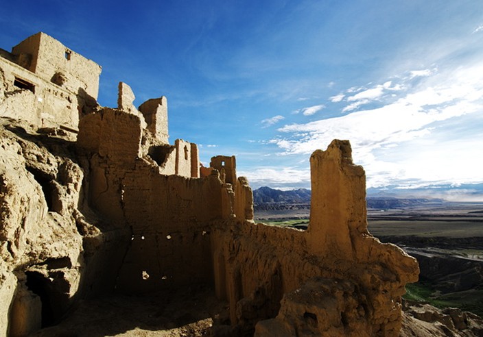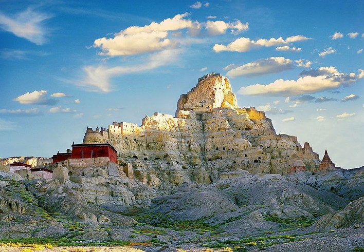 位于阿里地區的一座土山上。公元10世紀前半期建立,前后世襲了16個國王。王宮城堡是從10-16世紀不斷擴建的。古格王國遺址占地約18萬平方米, 從山麓到山頂高300余米,房屋建筑、佛塔和洞窟密布全山,達600余座,形成一座龐大的古建筑群。