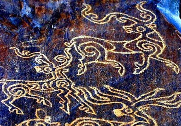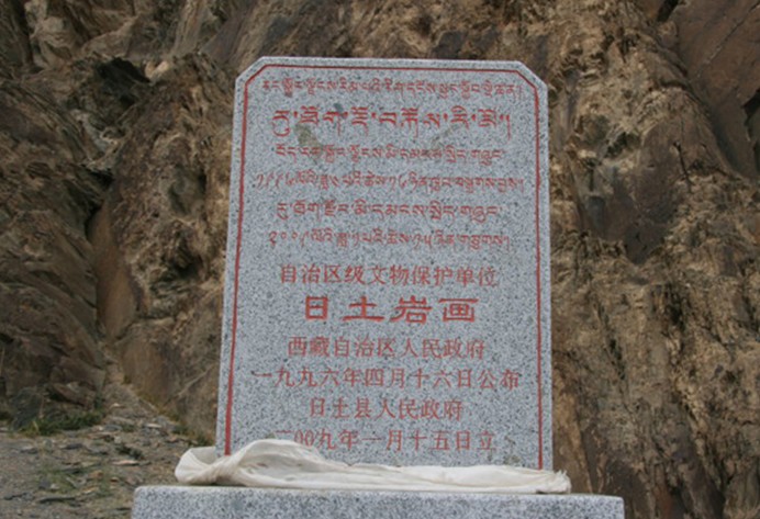 在西藏日土縣境內(nèi)的日松日姆棟、魯日納卡,日土山洞古壁畫(huà)是用堅(jiān)硬的石頭或其它硬物在巖面或巖石上刻鑿而成,線(xiàn)條筆劃有深有淺,還有少數(shù)彩繪畫(huà)面。巖畫(huà)內(nèi)容十分廣泛,有狩獵、宗教祭禮、騎乘、放牧、農(nóng)耕、日、月、山、牛、馬、羊、驢、羚羊、房屋、人物等。