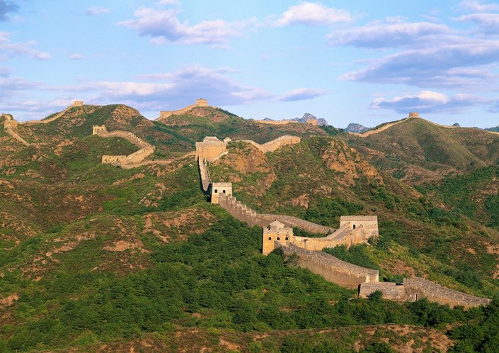 約公元前220年,一統(tǒng)天下的秦始皇,將修建于早些時(shí)候的一些斷續(xù)的防御工事連接成一個(gè)完整的防御系統(tǒng),用以抵抗來(lái)自北方的侵略。在明代(公元1368~1644年),又繼續(xù)加以修筑,使長(zhǎng)城成為世界上最長(zhǎng)的軍事設(shè)施。在文化藝術(shù)上的價(jià)值,足以與其在歷史和戰(zhàn)略上的重要性相媲美。