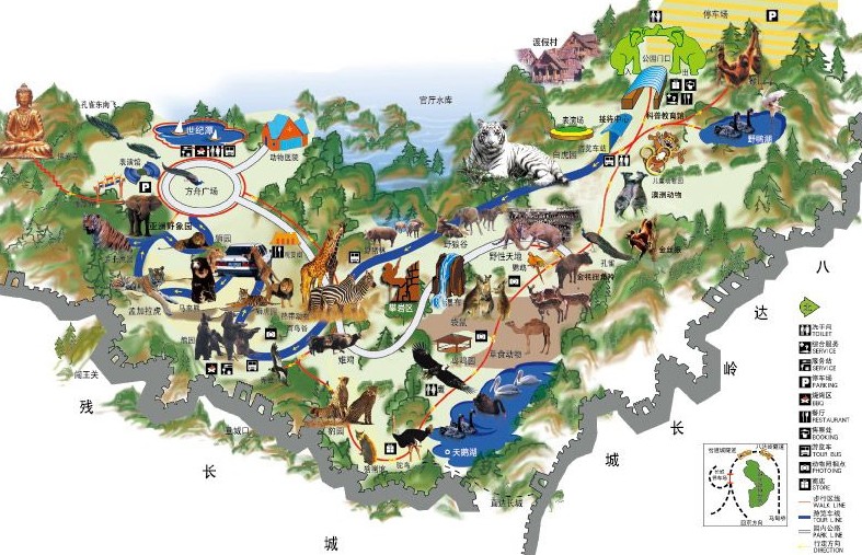 八達(dá)嶺野生動物世界設(shè)計建有30處景區(qū)及一個小型水庫,其中包括動物游覽區(qū)20處;古跡游覽區(qū)2處;表演場(館)4處;植物觀賞區(qū)1處;健身運動區(qū)2處。園內(nèi)動物規(guī)模有47種達(dá)兩千余只(頭)。