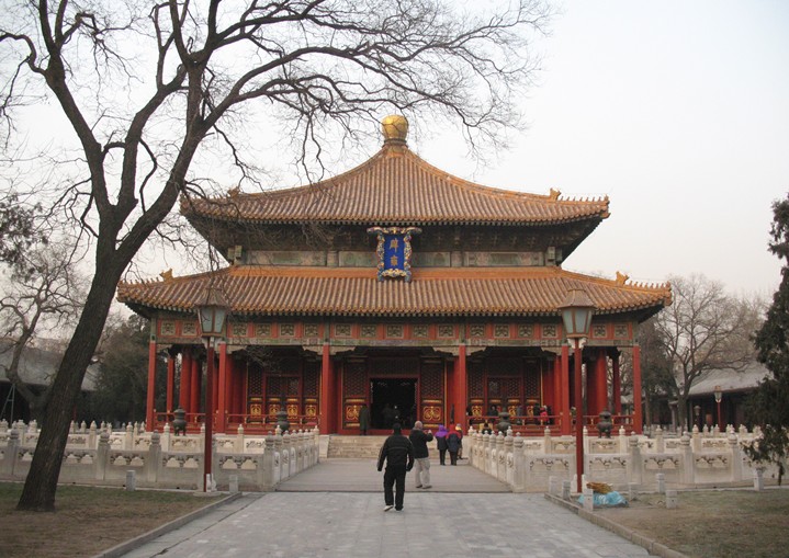 全國重點文物保護單位。位于北京城內東城區國子監街。占地2.2萬平方米。歷代多次重修,為元、明、清三代祭孔建筑,又名"先師廟"。廟坐北朝南,大門稱先師門,仍保持元代風格。前有琉璃壁及下馬碑,進門東西有碑亭、神廚、神庫等,并立有元、明、清三代進士題名碑118 方,題刻歷代進士5萬多名。進大成門至第二進院,正殿名大成殿,為孔廟主體建筑,面闊9間,進深5間,黃琉璃筒瓦重檐廡殿頂,殿前月臺三出陛,殿內供奉孔子及"四配"、"十二哲"。殿前有600余年樹齡的古柏一株,名"除奸柏",亦名"觸奸柏"。有古井一口,清高宗賜名"硯水湖"。大成殿后有崇圣祠,自成院落,為祭祀孔子先祖之地。今辟為首都博物館,展出北京地區出土的歷代珍貴文物。