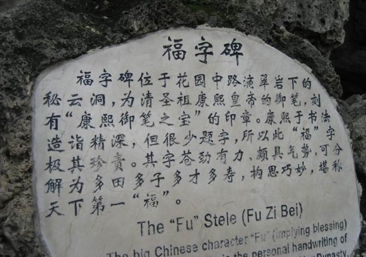 恭王府中”福”字碑藏在花園的假山內,這座假山是用糯米漿砌筑成的,非常堅固,山上置兩口缸,缸底有管子通到假山上,通過往缸中灌水的辦法來增加院中的濕度。假山下有一幽靜的“洞天”,稱秘云洞,洞的正中有一康熙皇帝為其祖母孝莊皇后祝壽寫的“福”字碑,刻有“康熙御筆”之寶印。碑高1米左右,長80厘米左右,貫穿整座假山。福字碑寓意福照全園,因為康熙留存人世的題字極少,所以福字碑倍顯珍貴。據說當年嘉慶查抄和珅府時,想把這個福字移到皇宮,但是由于和珅設計巧妙,動福就動龍脈,這是皇帝最忌諱的,大怒之下,下令將假山封死,從此,康熙墨寶福字在所有的史書中消失了。直到建國初,周總理在一次接見外賓之后在花園無意中發現假山上面石頭的形狀象龍頭,按說龍頭下必有國寶,于是馬上打電話給郭老(郭沫若),打開被封的洞門,發現了福字碑,經過文物部門的考證,確認其為康熙當年寫給孝莊太后的福字,而蓋在福字中央刻著“康熙御筆之寶”的大印已成為當今世上所留的唯一一個完整的康熙大印印章。