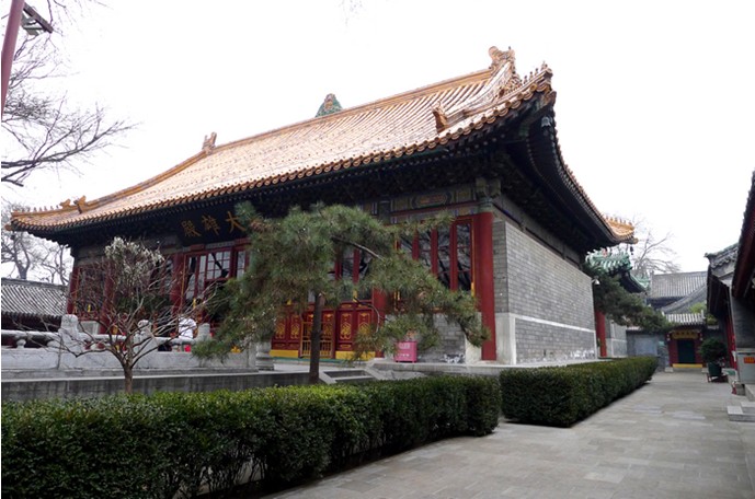 到廣濟(jì)寺朝禮的人們第一眼讓人注目的是天王殿。這里有明代仿唐三彩的四大天王,象征著“風(fēng)調(diào)雨順”。中間為明代銅彌勒像,與各地寺院看到的“大肚能容,容天下難容之事;開(kāi)口常笑,笑世間可笑之人”的布袋和尚像不同。布袋和尚只是傳說(shuō)中彌勒佛的化身形象,廣濟(jì)寺天王殿中所供奉的是——天冠彌勒。廣濟(jì)寺最大的殿堂是“大雄殿”。《法華經(jīng)•從地涌出品》:“善哉!善哉!大雄世尊”。大雄是佛陀的德號(hào),即偉大之英雄之意。佛具大智慧,能降伏魔障,故稱(chēng)大雄。廣濟(jì)寺大雄殿是帝王所敕建,故著黃琉璃瓦。殿脊有香水海,又名華藏世界海,整體呈山形,由水、蓮花和一個(gè)梵字構(gòu)成,寓意永恒世界、不生不死。此種殿脊在北京地區(qū)獨(dú)此一家。大雄殿所供奉的三世佛,即西側(cè)過(guò)去世迦葉佛,中間是現(xiàn)在世釋迦牟尼佛,東側(cè)是未來(lái)世的彌勒佛。這樣的組合供奉方式與常見(jiàn)寺院所供奉的西方世界阿彌陀佛、本師釋迦牟尼佛、東方世界藥師佛組合完全不同。佛是智慧之身,法性平等,所表達(dá)的合掌皈依仰慈悲,舉頭見(jiàn)佛生歡喜的精神完全相同。