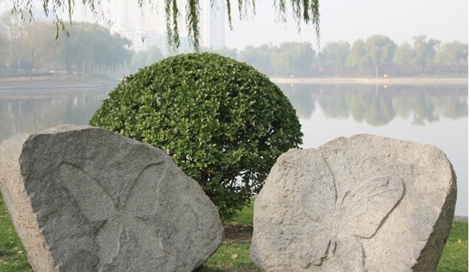標題:《蝴蝶夢》材質:花崗巖。高度:1米。作者:錢瑞澤。 創意:這個作品主要表達一種環保意識,假借史前化石的虛擬形象對滅絕的史前昆蟲之回憶,來呼喚人們對自然 的愛護。同時,也嘗試地表現化石的質感美,擴大視覺美感的范圍,以試圖豐富雕塑的美感因素。安放在植物觀賞區東北側,時間2000年5月。