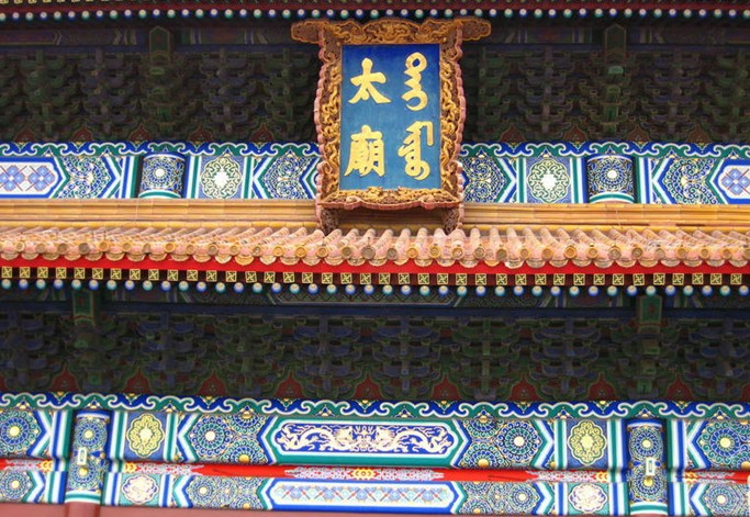 前殿,始建于明代,明末清初被毀得只剩有中間三間和殿柱。順治年間重修太廟大殿,完工后的大殿十一楹,深四楹,重檐列脊,殿額有滿漢文對照的"太廟"。殿外的三重臺基用漢白玉石欄環繞,月臺御道正面依次刻有龍文石、獅紋石和海獸石。殿內的大梁為沉香木,其余用金絲榆木;地鋪"金磚";版權所有山東聊城聊之旅國際旅行社有限公司,轉載必究!天花板及四柱,均貼有赤金葉。殿內供奉木制金漆的神座,帝座雕龍,后座雕風。座前陳放有供品、香案和銅爐等。兩側的配殿設皇族和功臣的牌位。