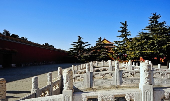 北京故宮紫禁城前出端門往東,經太廟街門進入太廟區。此區于太廟垣墻外滿布古柏。用常綠樹叢造成肅穆氣氛,是古代建筑綠化的成功經驗。進入太廟戟門,則庭院空敞,與垣外適成對比。