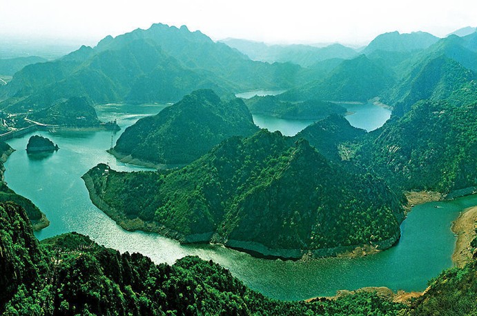 燕塞湖水域特色是狹長曲折,乘舟游覽大飽山重水復之慨。湖岸崖懸壁峭,令人驚心動魄,更有象形石多多,妙趣橫生:駝峰競岳、月鏡空山、神女浴日、金蟾戲水、靈龜深海、佛指蒼天……據說有十八景之多,無不惟妙惟肖,惹人神思遐想。燕塞湖湖光山色,美不勝收,譽為“北方小桂林”也不為過。