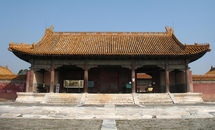昌陵的建筑形式與布局,跟泰陵基本一致,其豪華富麗亦不亞于泰陵。隆恩殿大柱包金飾云龍,金碧輝煌,地面用貴重的花斑石墁地,黃色的方石板上,帶有紫色花紋,光滑耀眼,好像滿堂寶石,別具特色。昌陵有清朝建立的最后一座圣德神功碑亭,此后清朝皇帝各陵均不建圣德神功碑亭。