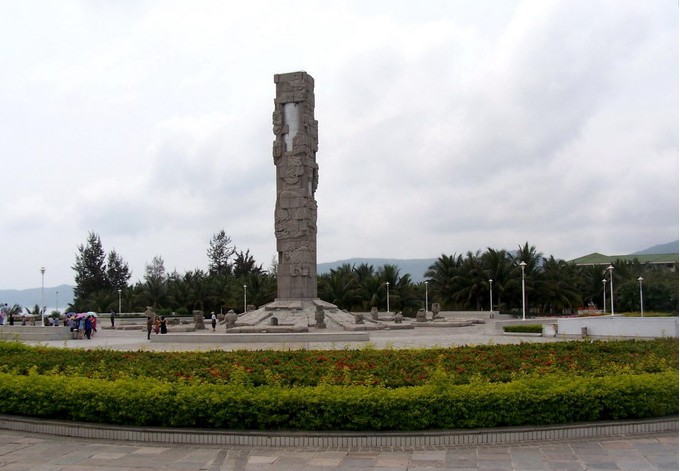 中心廣場即亞龍灣中心廣場,位于三亞市東南28公里處。廣場以圖 亞龍灣中心廣場騰柱向藍天升騰,以雕塑群向大地和大海延伸,其宏偉氣勢和獨特的藝術造型,以有限的藝術空間形式,引導我們的想象向無限的空間擴展。屹立的圖騰柱是廣場的最高點,高26.8米,由200多塊巨大的花崗石和直徑2.5米的鋁合金柱組成。上面雕刻有龍、鳳、太陽鳥、魚以及風雨雷電四神的圖案。 圍繞圖騰柱的中心雕塑區,形成三圈石硨,氣勢宏大、形象獨特:第一圈有蒼龍、白虎、朱雀、玄武四季標識與日晷24節氣雕塑;第二圈表現盤古開天地、女媧補天、嫦娥奔月、弄天舞干戚、大禹治水、牛郎織女、后羿射日、夸父追日等八個遠古神話;第三圈反映天文、人、動物、植物萬物生靈及八位中國古代之神。圖騰柱和雕塑群渾然一體,構成強烈的中國古天文意識和東方神秘色彩。廣場外圍設計的五組白色風帆式的尖頂帳篷及大型彩色噴泉,給具有古老文化意蘊的雕塑增添了現代氣息。