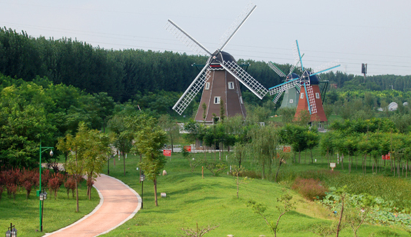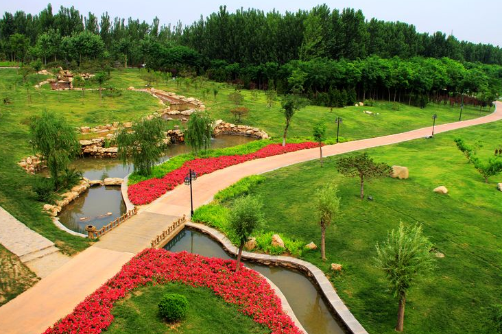 該公園以河為中心,在河兩岸種植蘆葦、蒲草,形成的濱水綠帶。用地總面積 4500畝,其中,水面積1000畝,綠化面積(人工改造部分)500畝。現種植各類苗木110多萬株、其中喬木1.5萬株,灌木40萬株,地被植物21萬株,水生植物45萬株,綠化工程投資120 萬元。常綠樹4種有雪松、黑松、龍柏、黃楊等;落葉樹20多種,如國槐、垂柳、合歡、苦楝等;藤本及地被植物有迎春、月季、凌霄、五葉地錦等;宿根花卉及應時花卉10多種,水生植物10多種。
