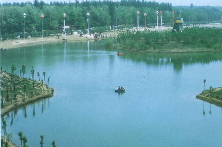 愉湖風(fēng)光區(qū),突出藍(lán)天、碧水、綠地的主題,以大片水面和大面積的森林景觀相映成趣。建有360畝的 沐浴庫(kù)區(qū),筑有假山、湖心島,配有游船、皮滑艇、動(dòng)力風(fēng)車等游樂設(shè)施。栽植榆、五角楓、金絲柳等觀賞植物28種17萬株,栽植草皮5.1萬平方米。疏林密地,青少年活動(dòng)區(qū),水上風(fēng)光區(qū),別墅區(qū),休療區(qū)等。與對(duì)餐交通干道臨南路融為一體,以大面積的水面和樹林塑造景觀。