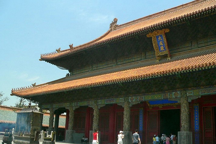 從杏壇北望,在雙層石欄的臺(tái)基上一座金黃色的大殿突兀凌空,雙重飛檐中海蘭色的豎匾上木刻貼金的群龍緊緊團(tuán)護(hù)著3個(gè)金色大字“大成殿”。字徑1米,是清雍正皇帝的手書。