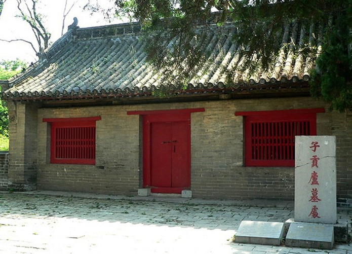 孔子墓西的3間西屋為子貢廬墓處??鬃铀篮?,眾弟子守墓3年,相訣而去,獨(dú)子貢在此又守3年。后人為紀(jì)念此事,建屋3間,立碑一座,題為“子貢廬墓處。”享殿之后,另有一座灰瓦攢尖頂?shù)姆酵?,稱“楷亭”。亭內(nèi)石碑上刻著一棵古老的楷樹,即摹自其南側(cè)的“子貢手植楷”。相傳子貢奔喪來后,將一棵楷樹苗栽于其師墓旁,后成大樹。清康熙間遭雷火焚死,后人將枯干圖象刻于石上。