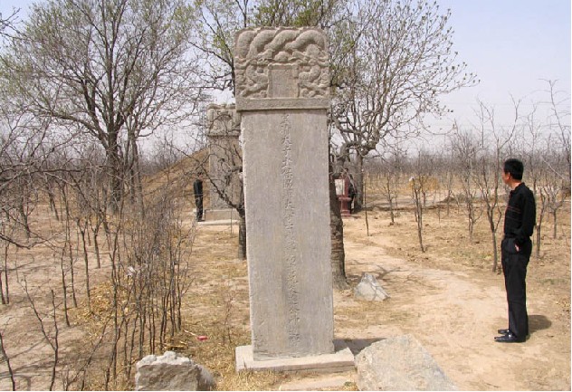 墓碑原地現墳丘東21米處,碑下基石上,有一片石灰混合土夯實地基,上鋪198×82厘米的兩塊青石板?,F尚存一塊,1989年修復墓地時鋪于墓碑之下。墓石合二為一,周邊有雕花。其上是一個巨型赑屃(石龜),已毀。從基石上還可看出石龜的爪痕。爪間距離前后爪距160厘米,左右爪距120厘米。赑屃背馱墓碑,碑冠已毀。從碑座到碑冠,整個墓碑通高5米左右。