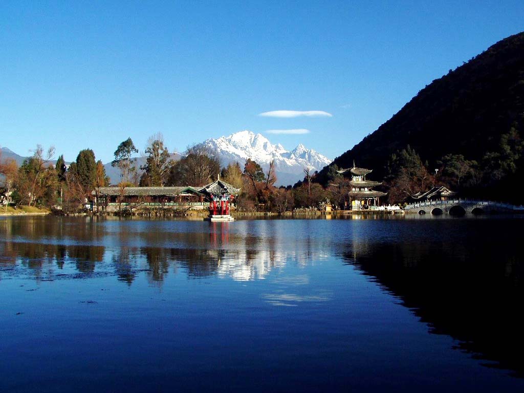 黑龍?zhí)豆珗@位于昆明北郊的龍泉山五老峰下,(亦稱龍泉山麓,太極山、五老山), 昆明黑龍?zhí)墩嫉孛娣e91.4公頃,距離市區(qū)約17公里。這里古木參天,泉壑幽邃,修竹茂林,潭深水碧,景色幽深。民間傳說有黑龍王潛藏于此,故稱黑龍?zhí)兑喾Q龍泉山麓,距離市區(qū)約17公里。黑龍?zhí)秲?nèi)有罕見的大型梅園,是昆明的賞梅勝地,稱為“龍泉探梅”。園內(nèi)的“唐梅”相傳由南詔移植過來,同安寧漕溪寺的“元梅”被認(rèn)為是云南最珍貴的古梅。在黑龍?zhí)秲?nèi)還有這樣的奇怪現(xiàn)象,潭以中間的石橋?yàn)榻缫环譃槎磺逡粷幔鍧嶂ゲ幌嗳冢瑩?jù)說連魚兒都互不過界,頗為神奇。黑龍?zhí)妒怯忻牡澜虅俚兀譃樯舷聝捎^,從漢代的黑水祠演變而來。上觀始建于唐宋時(shí)期,始稱龍泉觀,下觀始建于明代,俗稱黑水宮。1997年,黑龍?zhí)队斡[區(qū)占地3.6公頃。1999年,黑龍?zhí)队酗L(fēng)景林51.4公頃,植有各種喬灌木12萬多株。梅園28.5公頃,地栽梅5794株,盆栽梅1725盆。庭園占地6.9公頃,有喬木3973株,灌木48660株,修竹306叢。 1978年建苗圃,占地5.6公頃。建有杜鵑谷,植各種杜鵑10萬多株。1998年又新辟一期綠化工程,占地33公頃,游覽區(qū)擴(kuò)大到45.4公頃。園內(nèi)有昆明市綠化委員會(huì)掛牌保護(hù)的古樹名木18株,是昆明市存有古樹名木最多的風(fēng)景名勝區(qū)。麗江黑龍?zhí)妒冀ㄓ谇《辏?737),其后乾隆六十年、光緒十八年均有重修記載。舊名玉泉龍王廟,因獲清嘉慶、光緒兩朝皇帝敕封“龍神”而得名,后改稱黑龍?zhí)丁T娫疲?ldquo;泉渙渙兮漣漪,問何時(shí)最是可人?須領(lǐng)略月到天心,風(fēng)來水面;亭標(biāo)標(biāo)而矗立,看這般無窮深致,應(yīng)記取云飛畫棟,雨卷珠簾。”黑龍?zhí)兑云涮焐愘|(zhì),名列《中國名泉》、《中國風(fēng)景名勝》等書,誠不虛也。迎面見有一座涂金繪彩的牌樓,門口四尊石獅,肌理秀美,威武雄壯,過去守護(hù)木氏土司衙門,1966年遷此守護(hù)玉泉。進(jìn)門往右,但見垂柳飄指,一潭澄碧,樹底天光云影,樹梢樓臺(tái)隱現(xiàn)。沿潭右堤至鎖翠橋,橋上古人有聯(lián)云:“驚濤撼樹飛晴雪,未雨垂虹臥曲波。”它生動(dòng)地描繪了橋邊景致。右邊橋下三孔飛瀑,水花四濺,上觀景區(qū)濤聲如雷,流向古城,玉水河畔,楊柳依依,濃蔭蔽日。往橋的左邊看,一座五孔石拱橋,長虹臥波一般,將潭一分為二,玲瓏俊美的一文亭、得月樓分別屹立內(nèi)外潭心,四面臨水,有橋與岸上相連。此樓始建于清光緒二年(1876年),樓名取自古人對聯(lián)“近水樓臺(tái)先得月、向陽花木早逢春”中三字。1963年重建時(shí),郭沫若為該樓題寫了匾額“得月樓”三字及兩[1]副對聯(lián)。一副是集毛澤東詩詞句:春風(fēng)楊柳萬千條,風(fēng)景這邊獨(dú)好;飛起玉龍三百萬,江山如此多嬌。另一副是郭老撰書的楹聯(lián):龍?zhí)兜褂呈澹瑵擙堅(jiān)谔欤w龍?jiān)诘兀挥袼v橫半里許,墨玉為體,蒼玉為神。全聯(lián)僅三十字,卻寫出了麗江黑龍?zhí)兜纳耥崳瑫ㄥ賱哦鵀⒚摫挤牛瑸楣珗@增色不少。遠(yuǎn)處玉龍雪山倒遇潭中,可見“雪山四萬八千丈,銀屏一角深插底”奇景。象山半壁也映入水中,使黑龍?zhí)渡街杏兴杏猩剑剿嘤常吧珶o比秀麗。