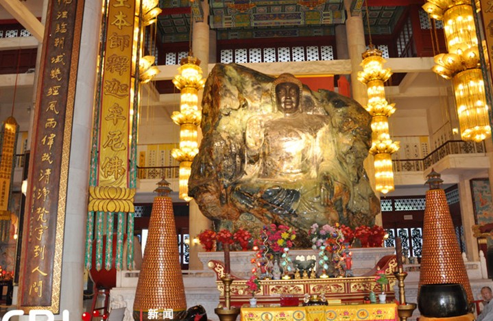 “玉石王”是一塊七彩花玉,各部位的顏色用現有的科學技術尚無法探明,人們擔心將佛面雕成花臉,但雕刻結束時,人們驚奇地發現,佛祖的面部恰恰刻在一塊純凈的墨綠色玉塊上,佛面靈光,神韻倍增,而佛祖的金冠恰逢一塊淡黃色的玉面。在整體上,顏色恰巧搭配成法相莊嚴的釋迦牟尼佛身披黑白相間的袈裟,打坐在蓮花寶座上,周圍七彩祥云繚繞,給人以心靈的震撼和慰藉。同樣,觀音的面部也恰好位于一塊晶瑩剔透的淡綠色玉面上。玉佛雕刻之完美可謂巧奪天工。