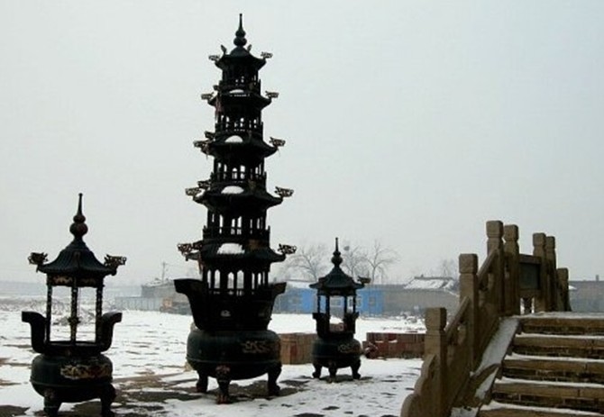 原四寺都有殿堂,據《盛京通志》卷九十七記載:永光寺原有大殿五楹,碑亭二座、天王殿三楹、鐘鼓樓二座、山門三楹。寺東寶塔一座,禪堂僧房二十四間。延壽寺原有大殿五楹、經堂三楹、碑亭二座、天王殿三楹、鐘鼓樓二座、寺西寶塔一座、山門三楹、晾經樓一楹、禪堂僧房三十間。廣慈寺原有大殿五楹、碑亭二座、天王殿三楹,鐘鼓樓二座、寺南塔一座、山門三楹……。現在四寺的殿堂,除法輪寺保留大殿五楹,天王殿三楹,東西配殿各五楹,寺北寶塔一座,山門三楹外,其它各寺的建筑均已無存。四塔的建造形式,均為藏式喇嘛塔,是由基座、塔身、相輪三部分構成。基座為方形束腰須彌座,有上下框,在四角和每面中間立有兩根石柱,從而每面構成三個壸門。石柱上都雕有寶相花、西蕃蓮等紋飾。每面中間壸門置磚雕寶盆和火焰,左右壸門都有高大凸起的磚雕雄獅。基座上框之上又起三層磚砌圓壇座。上面即是寶瓶式塔身塔身的南面辟有佛龕內供神牌,佛龕周圍嵌流麗的云珠。塔身之上為十三層相輪,再上為塔剎,版權所有山東聊城聊之旅國際旅行社有限公司,轉載必究!由銅鑄仰伏寶蓋、日、月、寶珠組成。寶蓋之下懸風鐸。西塔因年久失修,已殘破不堪,于1968年拆除。西塔塔身內出有五谷、松柏樹枝、香泥小塔、金銀塊和金珠、琥珀珠、瑪瑙珠、寶石珠等,還有多種文字的經卷。在地宮中出土了銅質鎏金天地佛(系密宗大威德金剛),天佛是一頭四面,頭戴王冠,頭上還有一立佛,十二只手臂,手中握有降魔杵,捆仙索,照妖鏡等法器。地佛與天佛相擁,手中也握有法器。天地佛身下懸有許多人頭,腳下踩著一仰一伏的兩個魔身。地宮中還出有塔式小銀盒,盒內裝一小葫蘆,玉匜。在一景泰蘭盤內裝有琥珀珠、碧璽珠、藍色料珠、綠松石,紅寶石、藍寶石,孔雀石,是為七寶,還有果品等。當為天地佛供養之物。