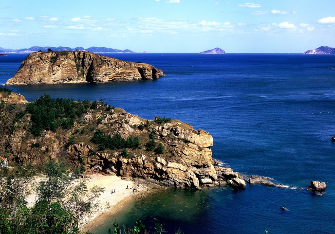 景區北部為群山環繞,蒼松翠柏。南面是開闊的海域和平坦的沙灘,遠處的三山島,云遮霧罩,恍如蓬萊。 島上岸崖陡峭,怪石嶙峋,山花野草遍及全島。