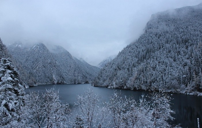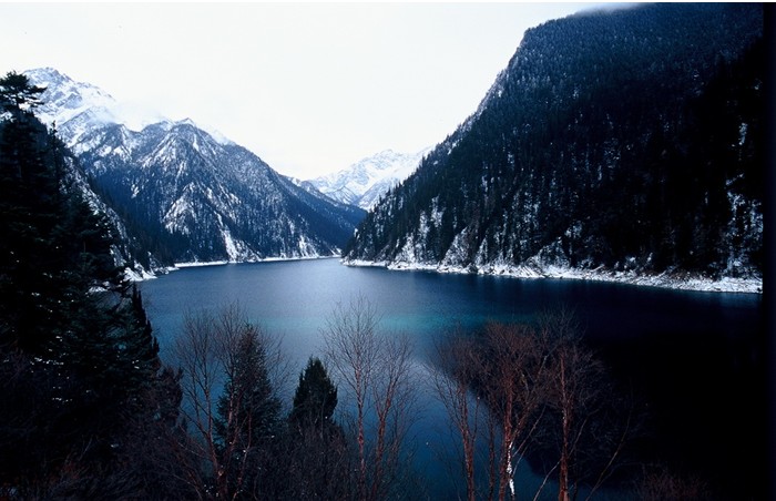 長海海拔3060米,最高處4457米,面積約200萬平方米。長約8公里,順山彎去,頭深藏在層巒疊嶂的山谷之中,是九寨溝最大的海子。海子對面,雪峰皚皚,冰斗、“U”字谷等典型冰川景觀,歷歷在目,岸旁林木葉茂,一眼望去,水似明鏡,巍巍雪峰,沐浴在藍天白云之中,壯觀奇麗。此湖區水面大,但無地表出水口,夏秋暴雨,水不溢堤,冬春久旱,亦不干涸。藏胞贊美它是“裝不滿、漏不干的寶葫蘆”。隆冬時節,冰凍厚達60厘米,傳有怪獸出沒。