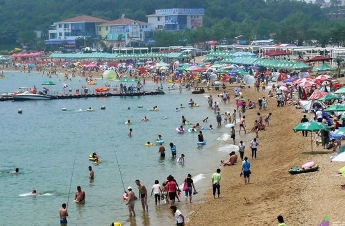 碧波泛彩疑無(wú)涯, 華傘半遮嬉水丫。老虎灘上赤足爽, 傅家莊外卵石滑。