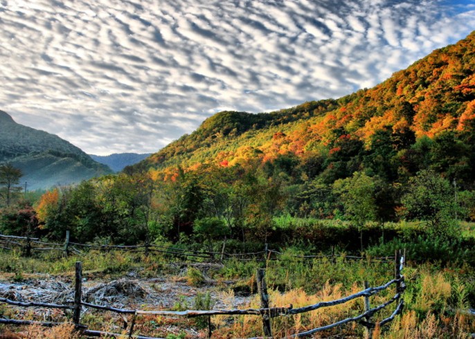 早年間叫的是“養胡溝”,是深山老林中土匪藏身的地方。東北地管土匪叫胡子,“養胡溝”就是養胡子的地方了。當然了,解放后也就不再叫這名字。上個世紀末本桓線還沒修通,但已經有大批的畫家追尋美景爬山涉水來這里寫生,人稱“畫家村”。99年通車后,這里又成了旅游者秋游的好去處,洋湖溝的名聲就傳揚開了。被國家旅游總局命名為“中華楓葉第一路”。